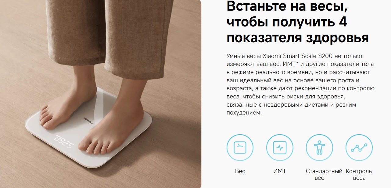 Особенности: умные весы Xiaomi Smart Scale S200 оснащены датчиком из марганцевой стали в форме буквы E с минимальным шагом измерения 0,05 кг; синхронизация с Android 8 или iOS 12 и выше; взвешивайте людей и предметов; сверхдлинный срок службы батареи; смарт-весы Xiaomi S200 можно подключить к приложению Xiaomi Home и хранить информацию для 36 пользователей; весы не только измеряют ваш вес, ИМТ и другие показатели тела в режиме реального времени, но и рассчитывают ваш идеальный вес на основе вашего роста и возраста, а также дают рекомендации по контролю веса, чтобы снизить риски для здоровья, связанные с нездоровыми диетами и резким похудением