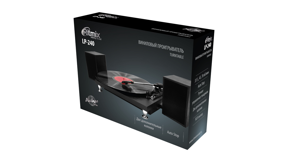 Комплектация: виниловый проигрыватель LP-240, 2 × стационарная колонка для LP-240, адаптер для пластинок на 45; оборотов в минуту; инструкция пользователя; гарантийный талон