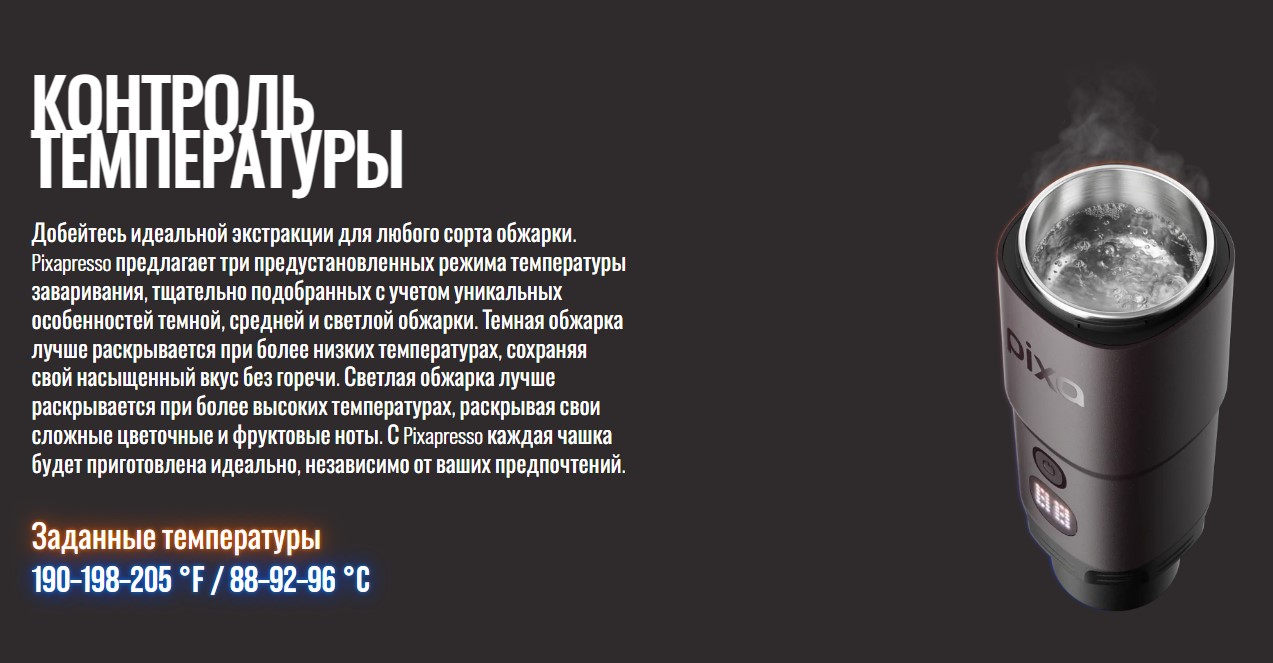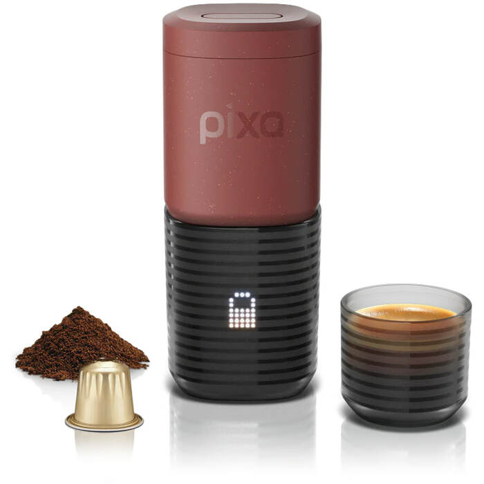 Особенности: Pixapresso — первая компактная электрическая портативная эспрессо-машина Wacaco, разработанная для ценителей эспрессо, которые не хотят идти на компромиссы в вопросах удобства, где бы они ни находились; объёмы чашки/чашки эспрессо: 300/100 мл; стандартные настройки температуры на 88-92-96 °С; автоматическое отключение после 1 минуты бездействия; совместимо с неспрессо капсулами; объём воды 120 мл; хватает для приготовления 5 эспрессо