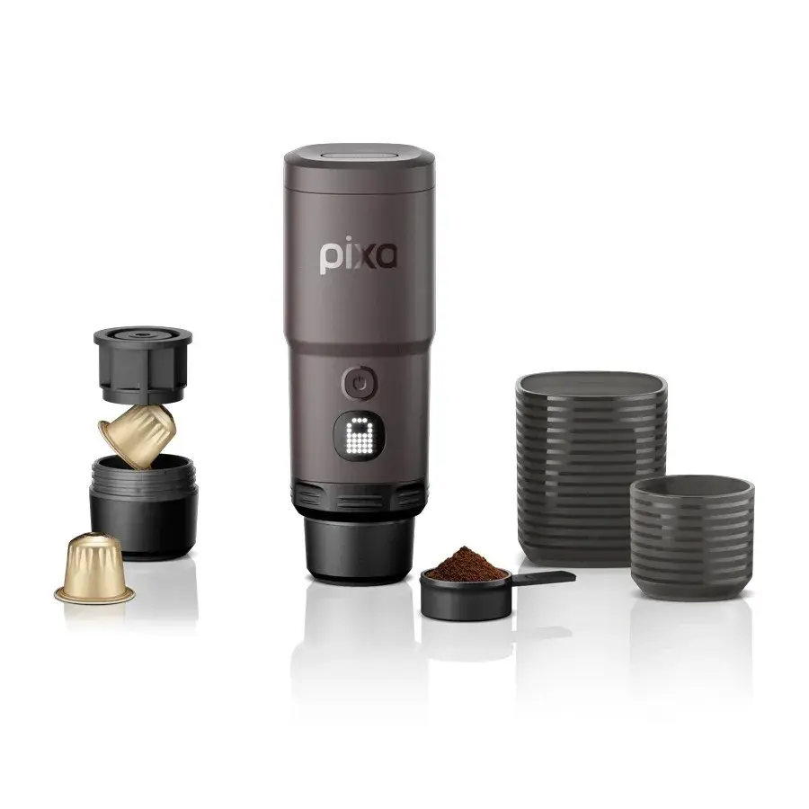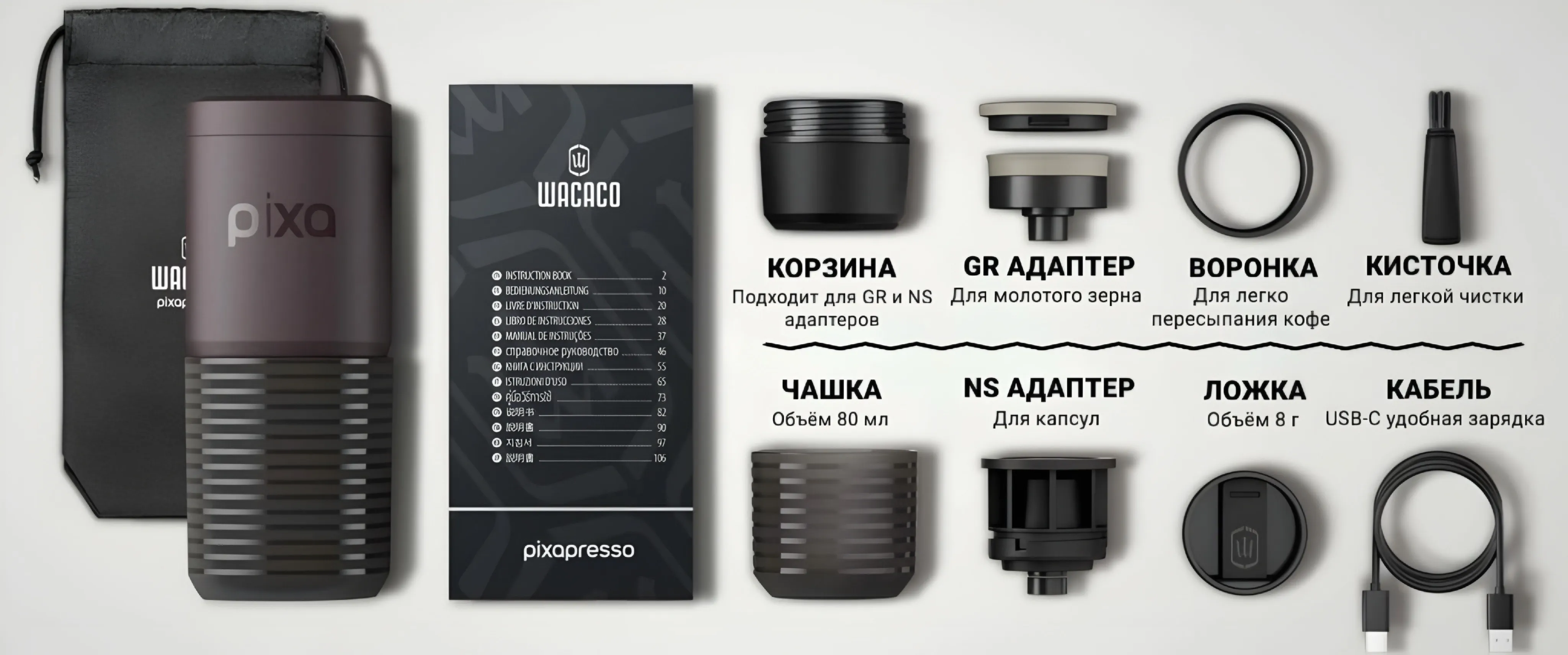 Комплектация: кофемашина Pixapresso, адаптер для молотого кофе, адаптер для Nespresso капсул, чашка, чашка эспрессо, мерная ложка/темпер, кисточка, воронка, чехол, USB-С-кабель, инструкция, гарантийный талон
